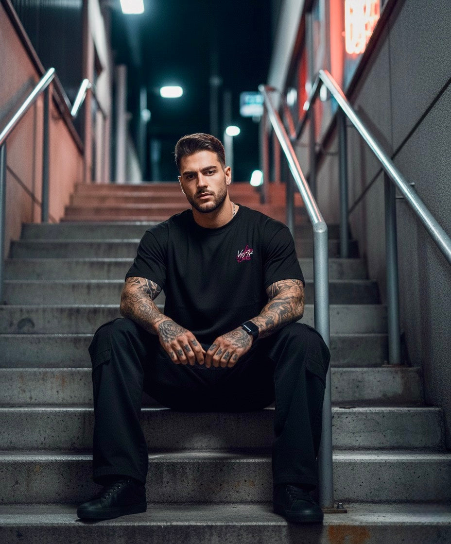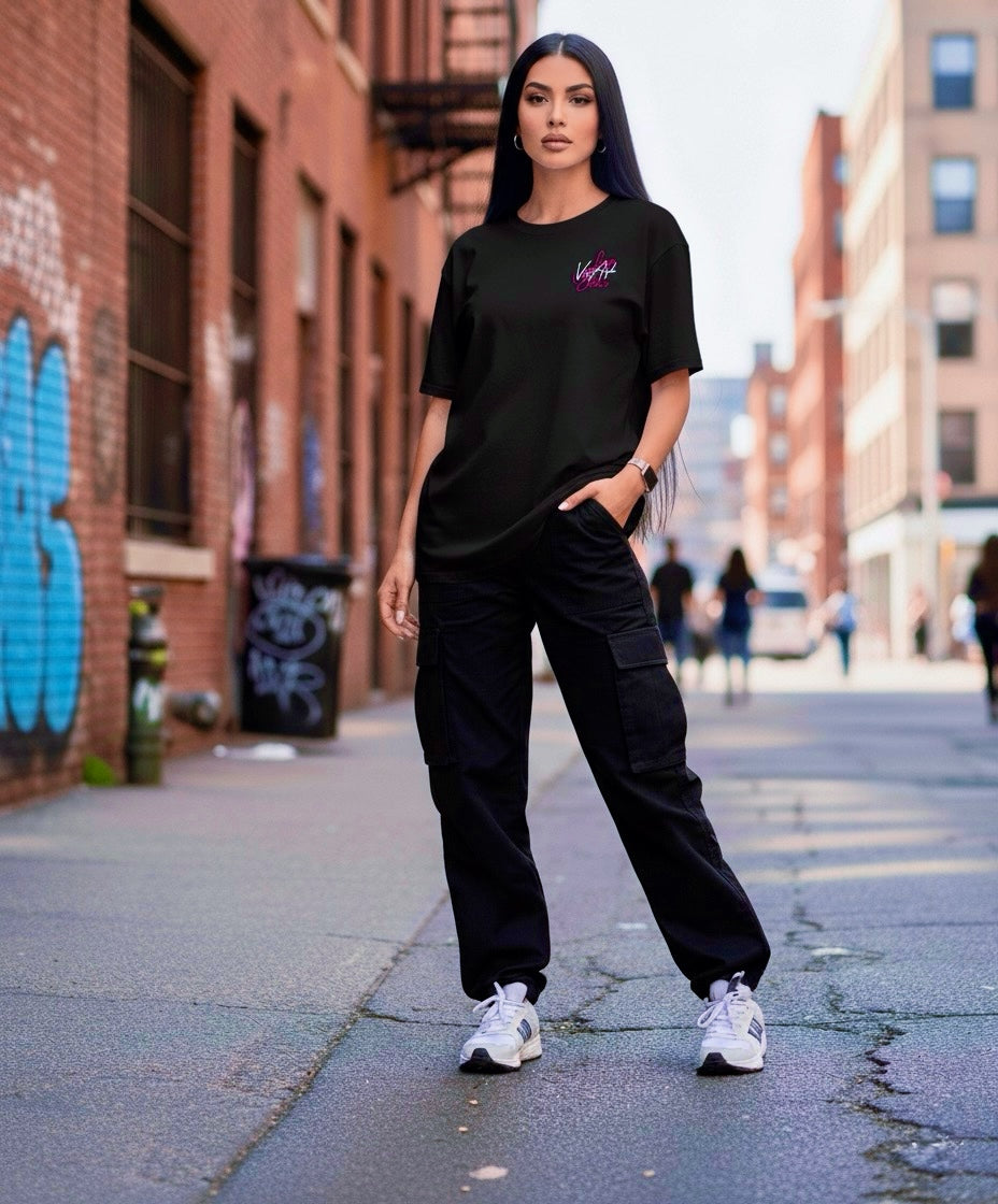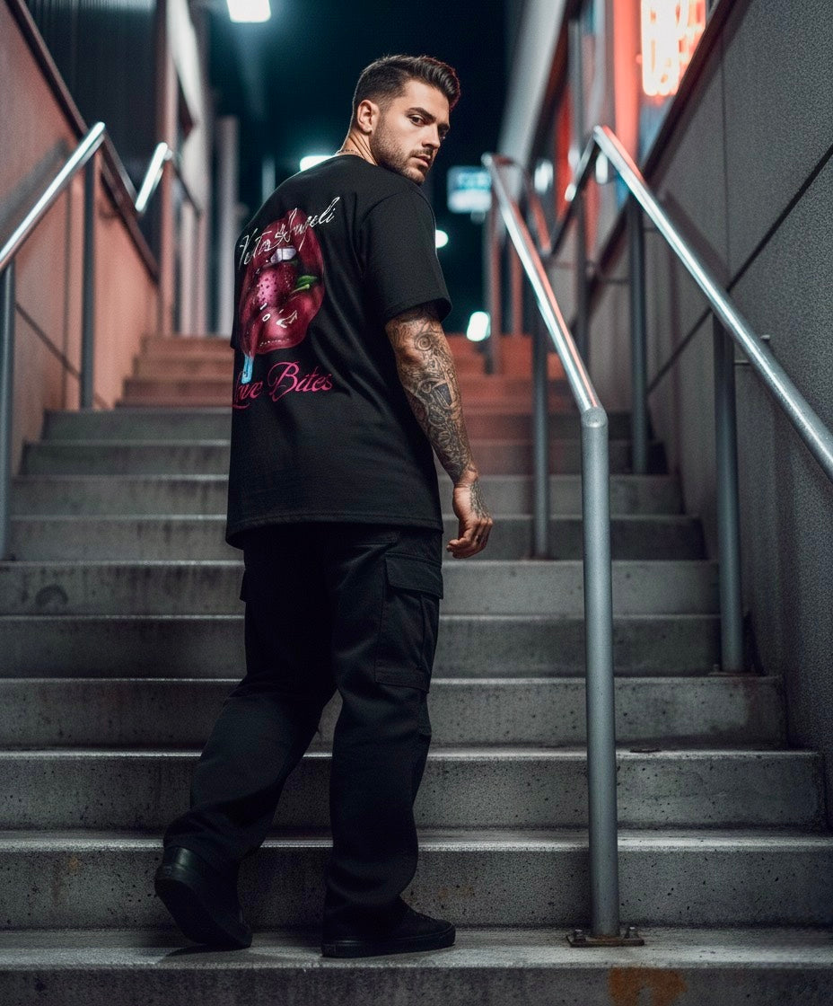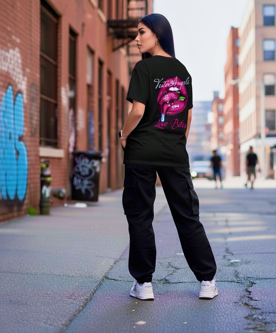 Provocadora, atrevida y con un diseño que no pasa desapercibido. La ilustración de labios mordiendo una fresa transmite pasión y rebeldía, reforzada con colores vibrantes que contrastan sobre el negro intenso. El detalle de la tipografía en estilo elegante eleva la prenda, fusionando sensualidad y streetwear en una sola pieza. Confeccionada en algodón premium, es la elección perfecta para quienes buscan destacar con una actitud audaz y sin filtros.